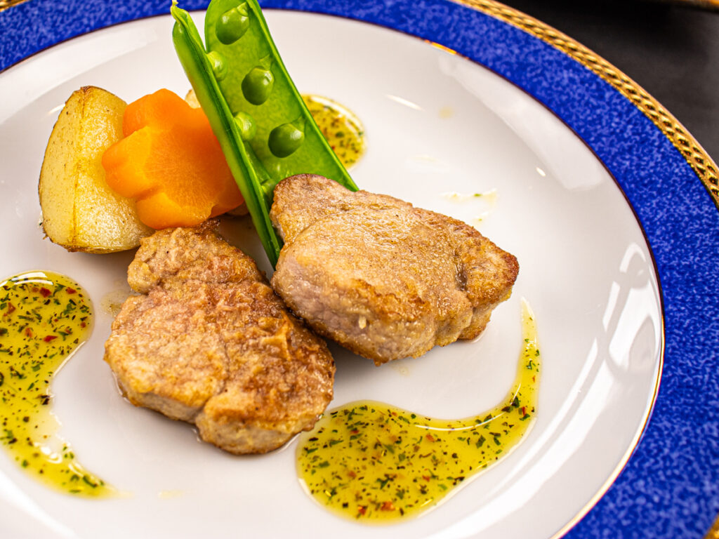 【洋皿】豚ヒレ肉のソテーを、バジルソースで温野菜と共にご賞味くださいませ。