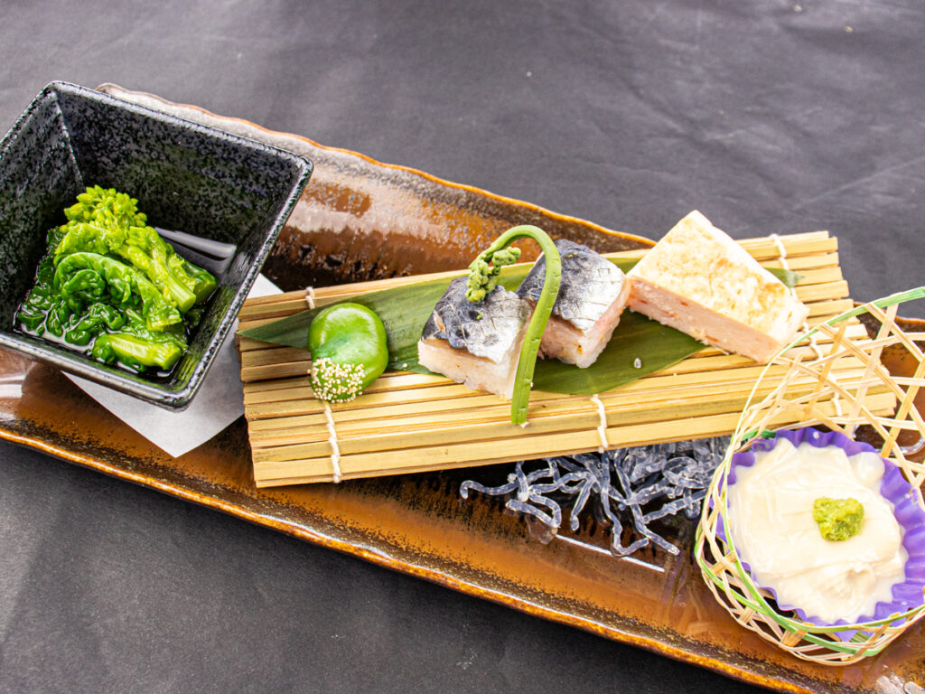 【前菜】「桜海老ふくさ」「鰯の棒寿司」「菜の花のお浸し」「かぎ蕨」など旬の食材を、前菜でふんだんにご賞味いただけます。